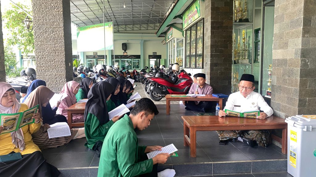 Trenggalek – Dalam rangka memperingati Hari Santri Nasional yang jatuh pada tanggal 22 Oktober, MTsN 1 Trenggalek menggelar kegiatan Khotmil Quran secara serentak pada Senin (20/8). Cuaca cerah yang menyambut pagi hari menambah kekhusyukan suasana di lingkungan madrasah. Kegiatan ini menjadi wujud nyata semangat religius dan nasionalisme yang terus ditanamkan kepada seluruh warga madrasah.